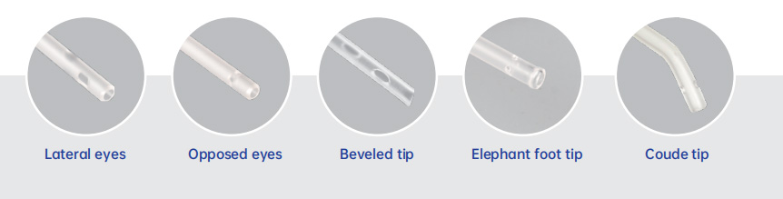 - Atraumatic, soft rounded, open distal end with lateral eyes or opposed eyes for non-traumatic insertion.