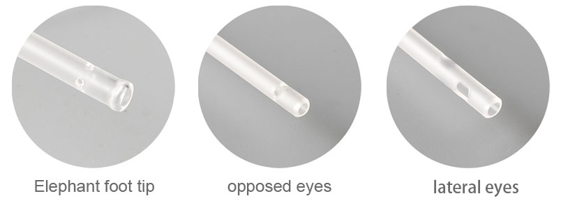 - Atraumatic, soft rounded, open distal end with lateral eyes or opposed eyes for non-traumatic insertion.